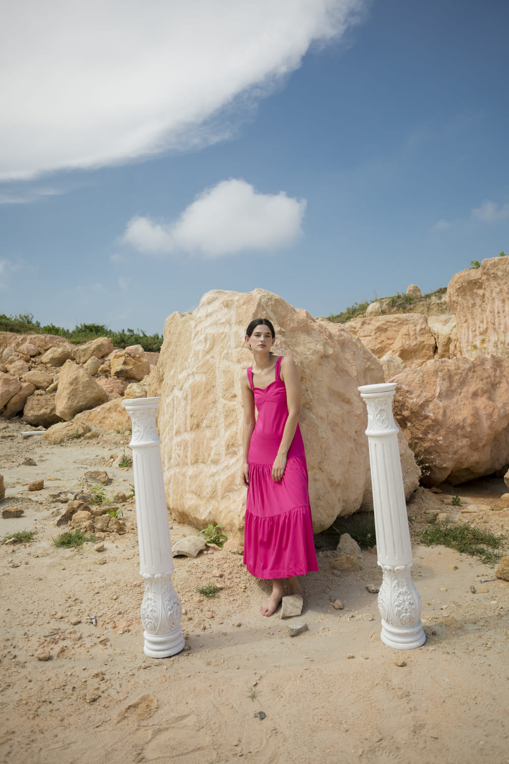 Long, flowy dress with a straight neckline and straps. Made from viscose rayon, it offers lightness, softness, and comfort. Model wears size S.