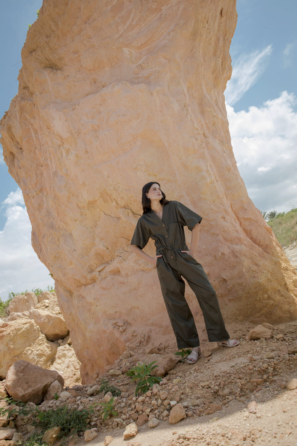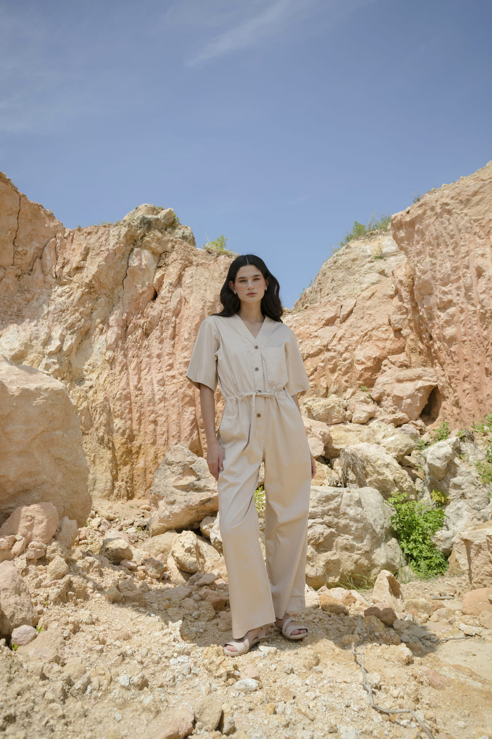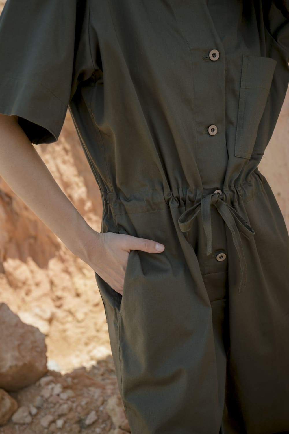 Relaxed-fit romper with a classic collar, front button closure, and functional pockets. Made from drill fabric, it offers structure and comfort for a casual look. Model wears size S.