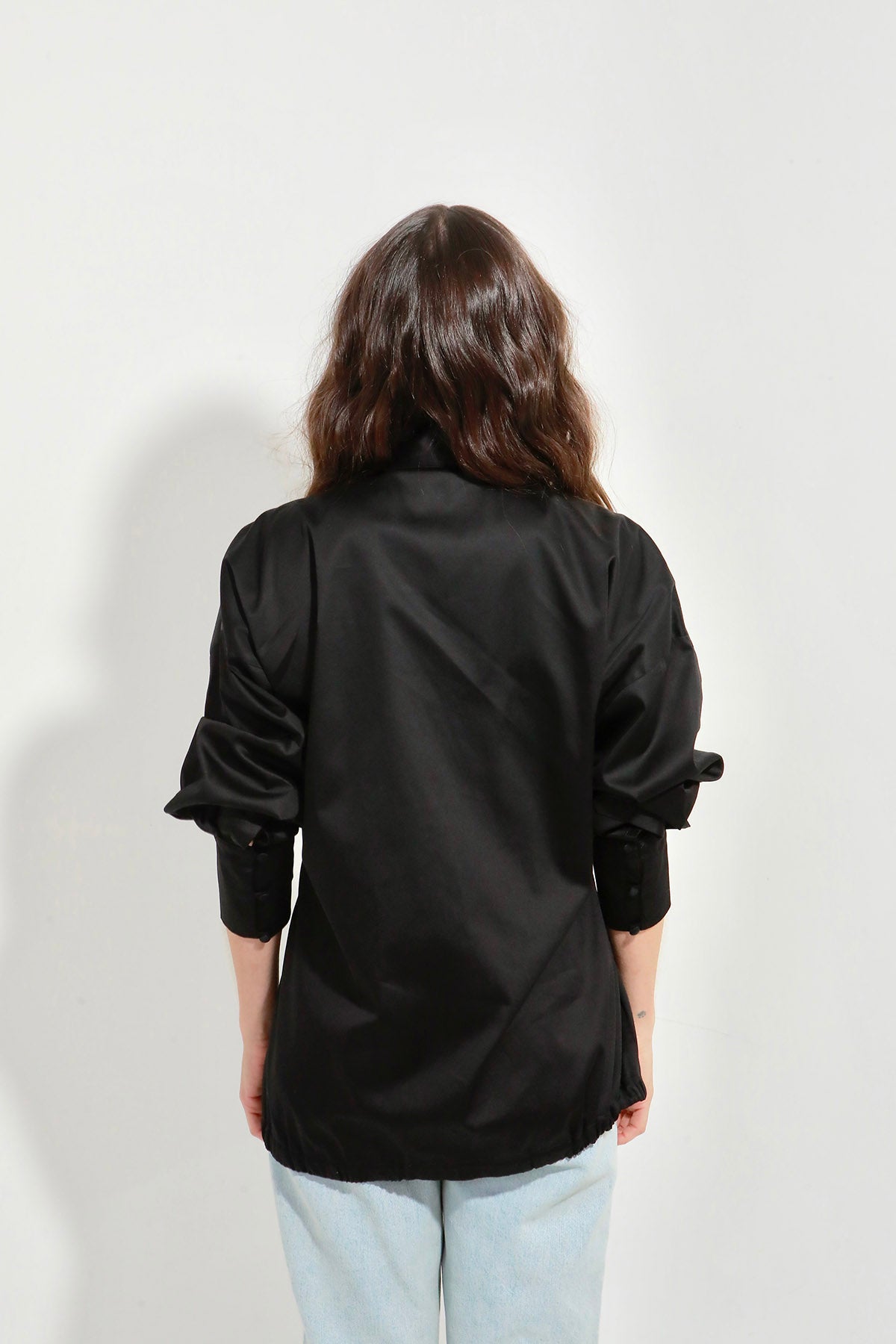 Long-sleeve blouse with defined cuffs, a Mandarin collar, and adjustable waist ties for a personalized fit. Made from satin cotton, it provides softness, structure, and an elegant finish. Model wears size S.