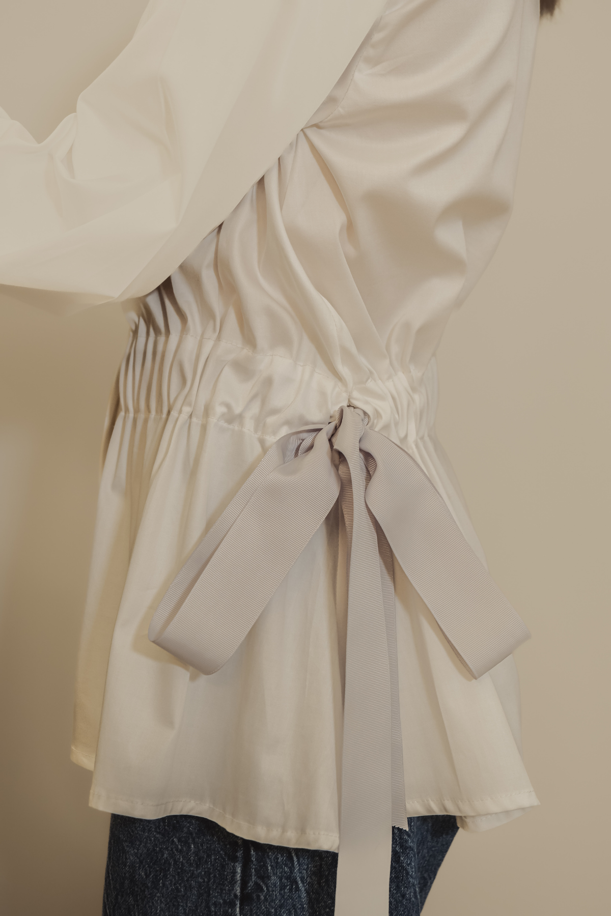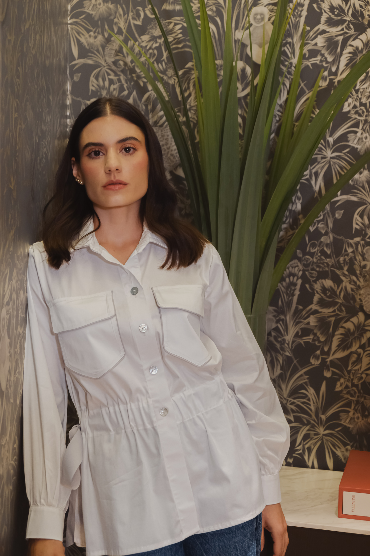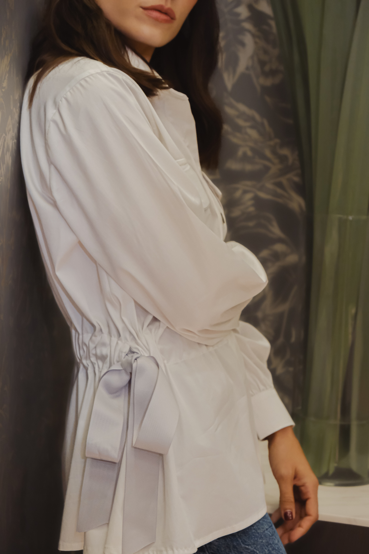 Blouse with front pockets, gathered waist, and decorative side tie. Made from poplin cotton, it features a relaxed fit, front buttons, and long sleeves with cuffs. Model wears size S.