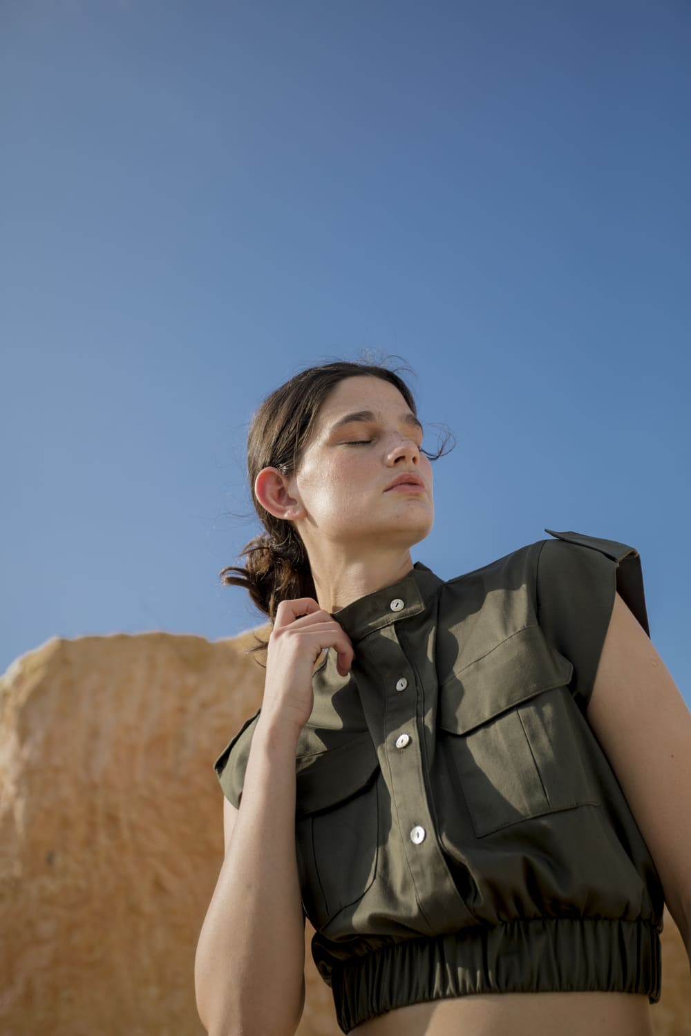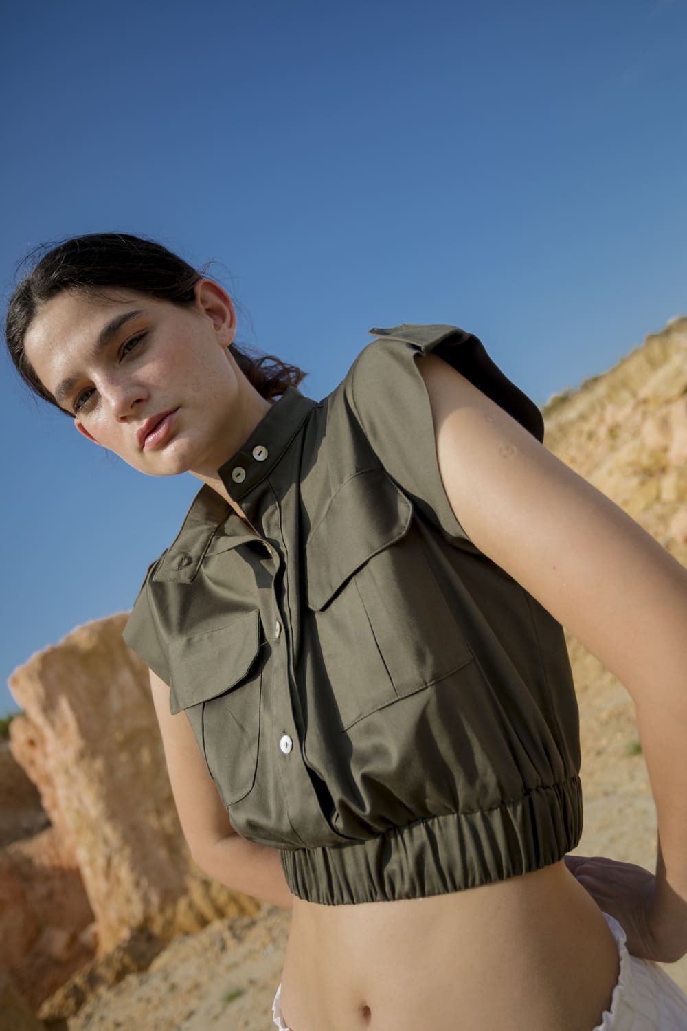 Cropped blouse with front buttons, pockets, and an elastic hem for a better fit. Made from drill fabric, it offers structure and comfort. Model wears size S.