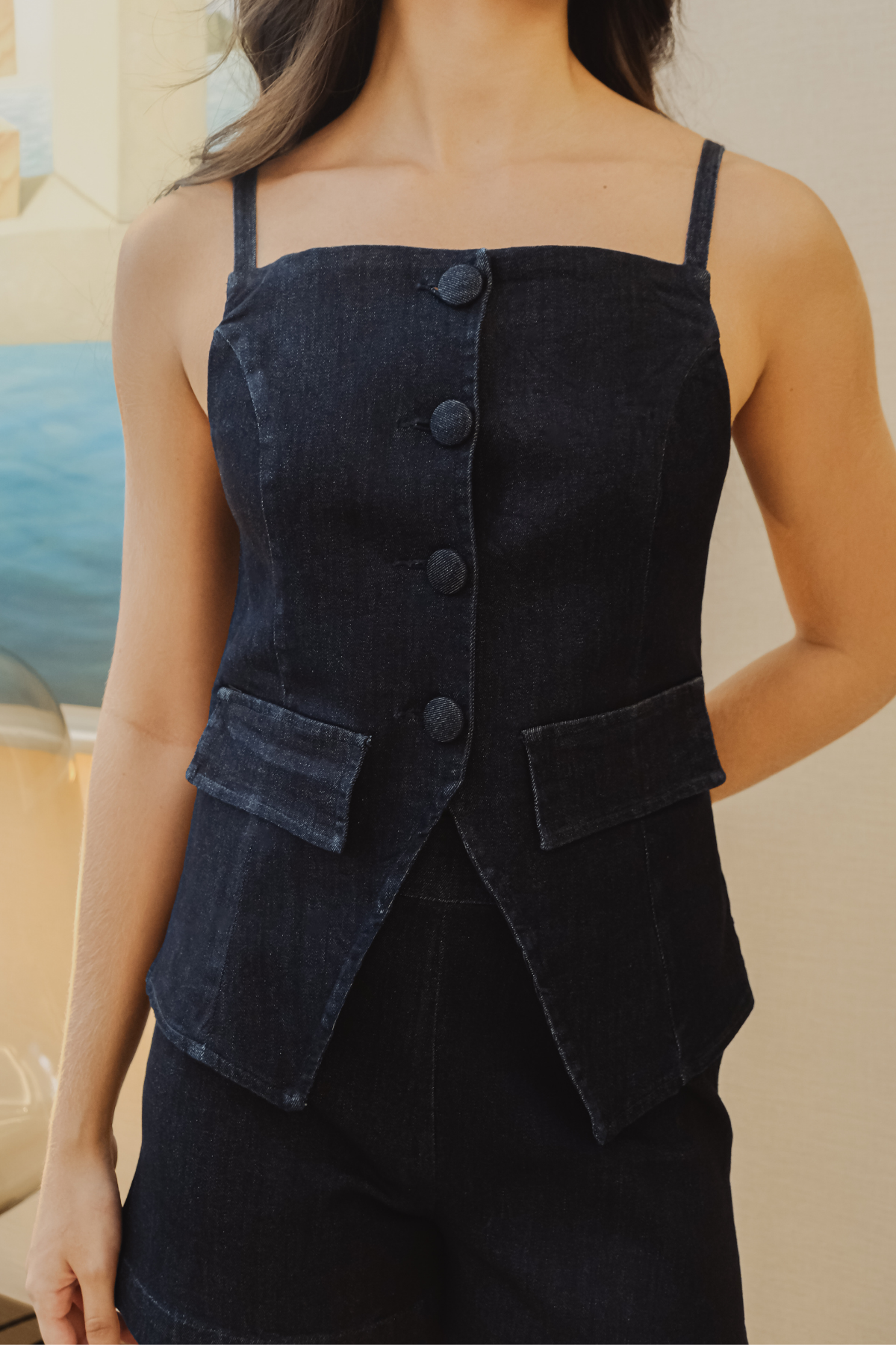 Top with thin straps, straight neckline, front button closure, and decorative pockets. Made of denim, it offers structure, versatility, and a modern look. Perfect to wear as a set with the Jimena Short. Model is wearing size S.