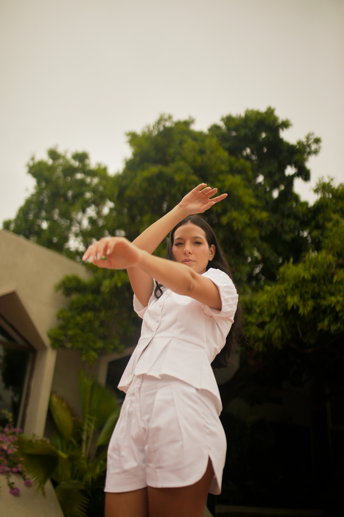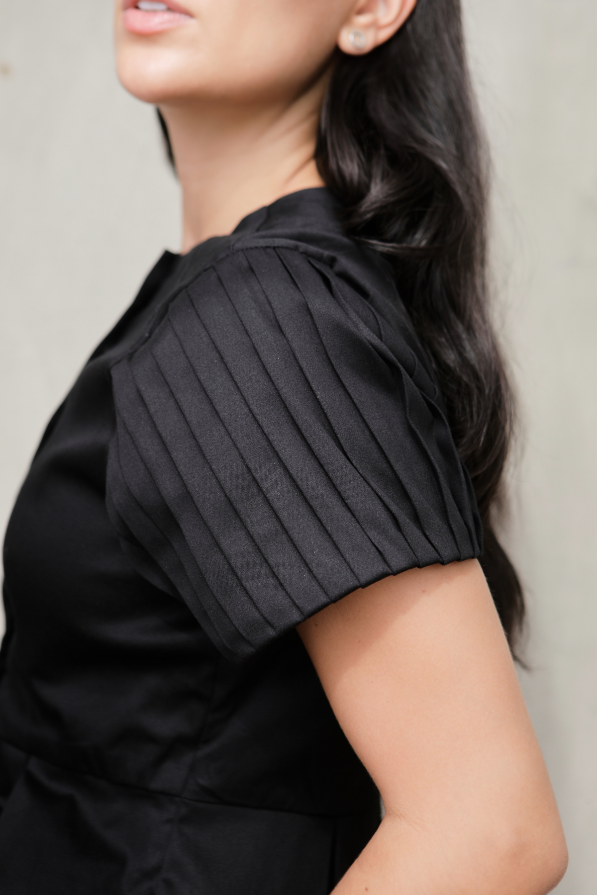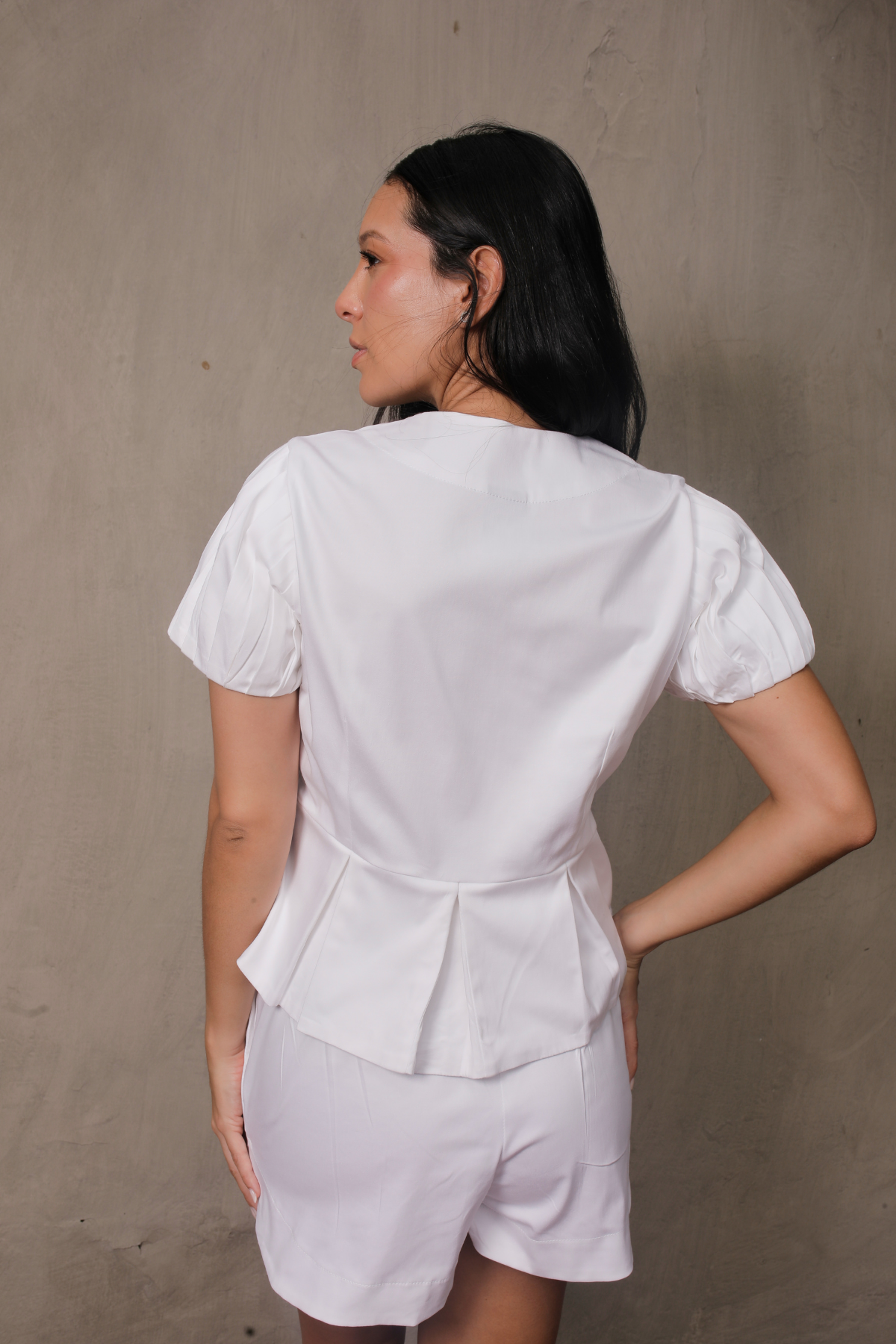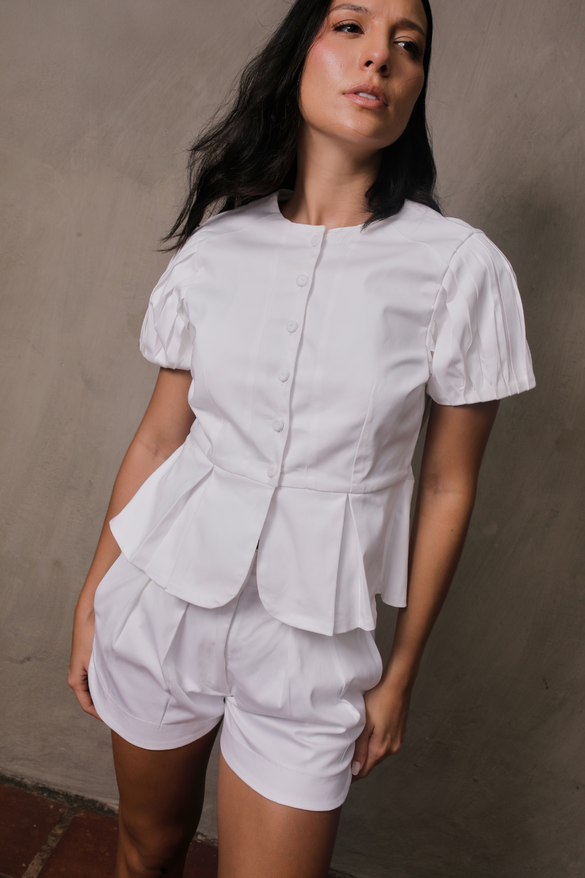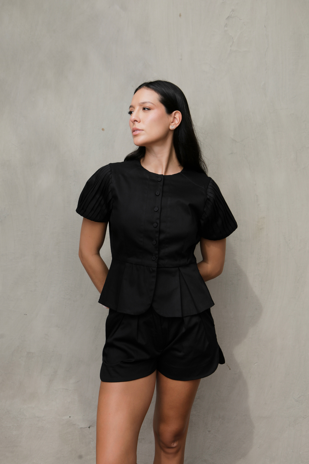 Two-piece set crafted in soft twill. The top features a round neckline, visible fabric-covered buttons, and pleated sleeves that add structure, plus a delicate peplum-style hem that defines the silhouette. The shorts include an elastic waistband at the back for added comfort and functional side pockets. A versatile set ideal for a modern, casual look. The model is wearing size S and is 1.74 m tall.