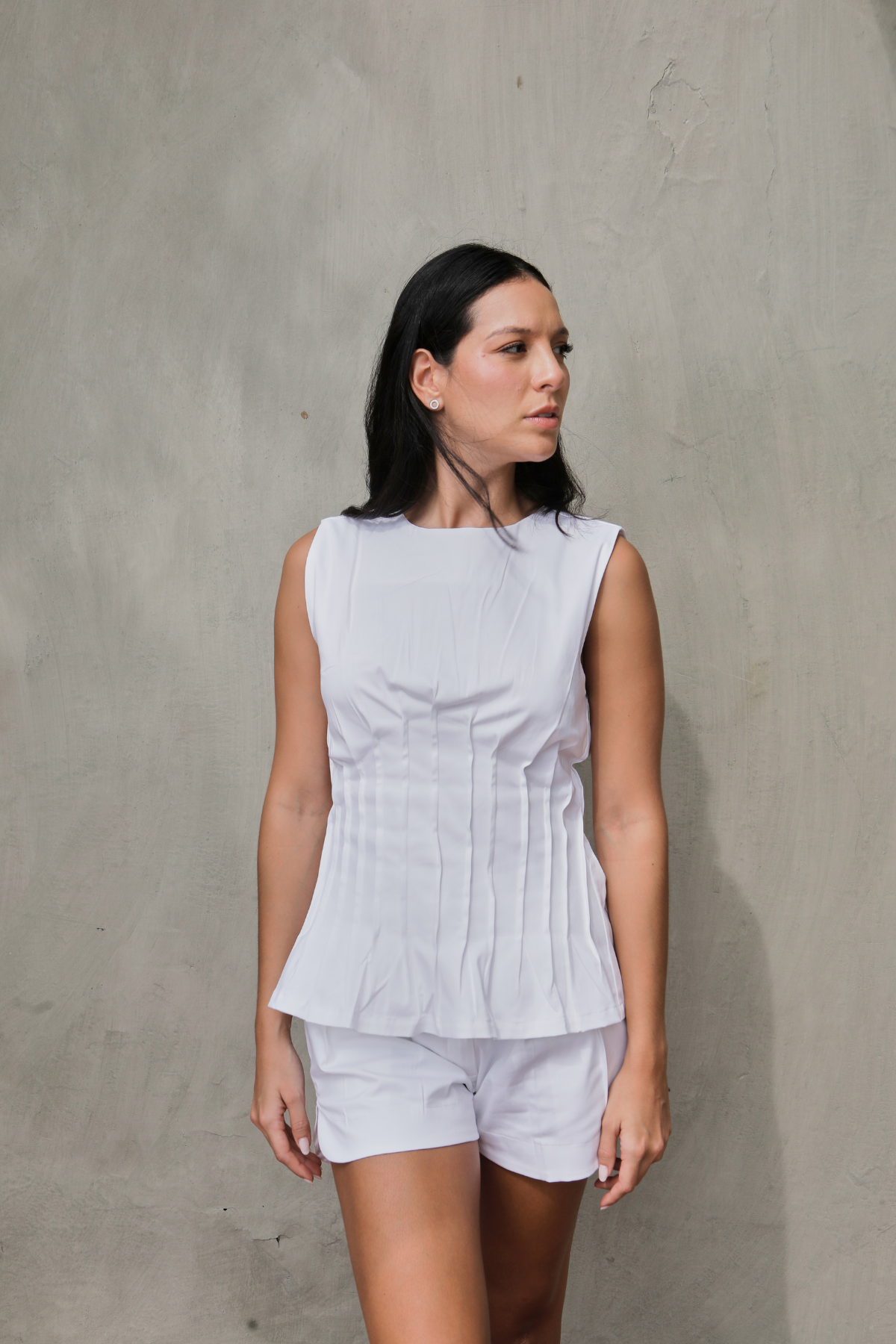 Top with subtle front and back pintuck details, fitted at the waist to enhance the feminine silhouette. Crafted in soft twill, it offers a light texture with gentle structure, ideal for both casual and dressier looks. The model is wearing size S and is 1.74 m tall.