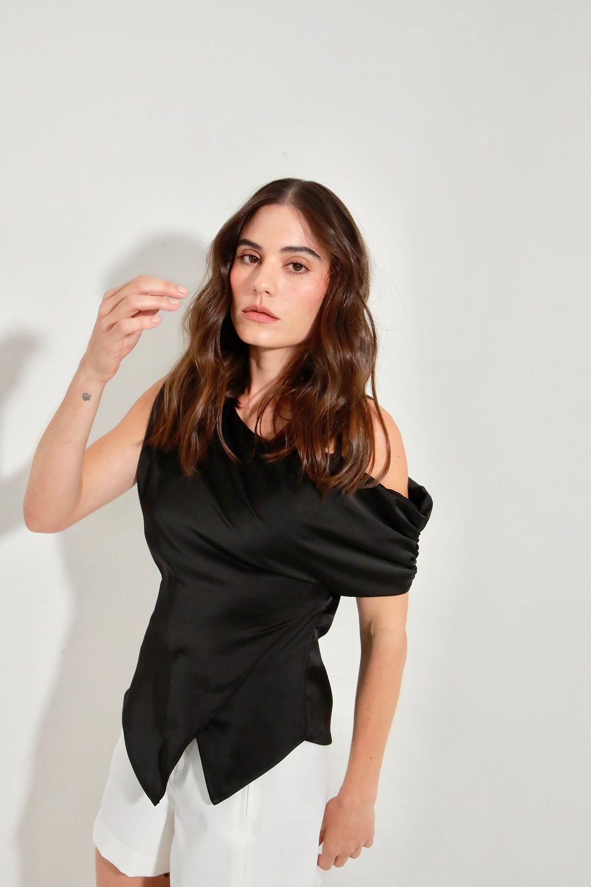 Asymmetric blouse with a single dropped sleeve, supported by a shoulder strap and invisible drawstring for adjustment. Made from silk, it offers a light silhouette and elegant finish. Model wears size S.