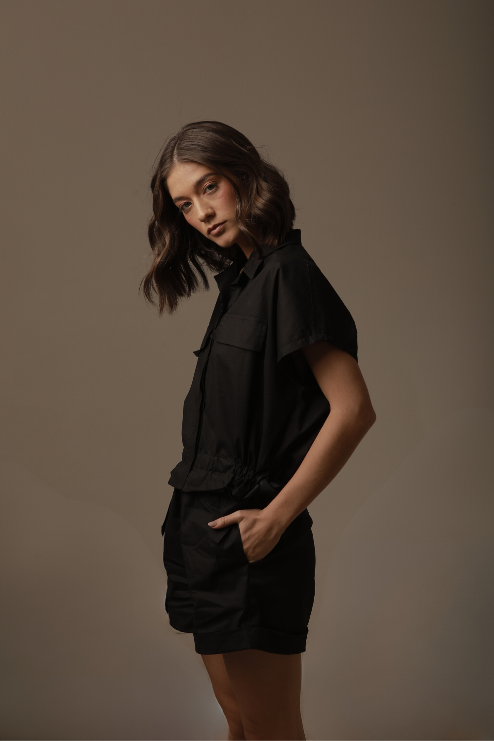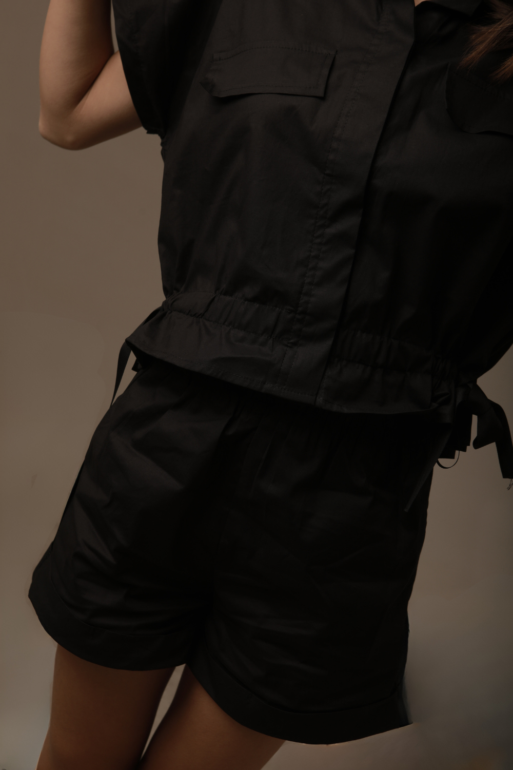 Two-piece set featuring a short-sleeved top with concealed front buttons and side tie adjustment, and shorts with an elastic waistband and side pockets. Made from poplin cotton for added freshness and comfort. Model is wearing size S.