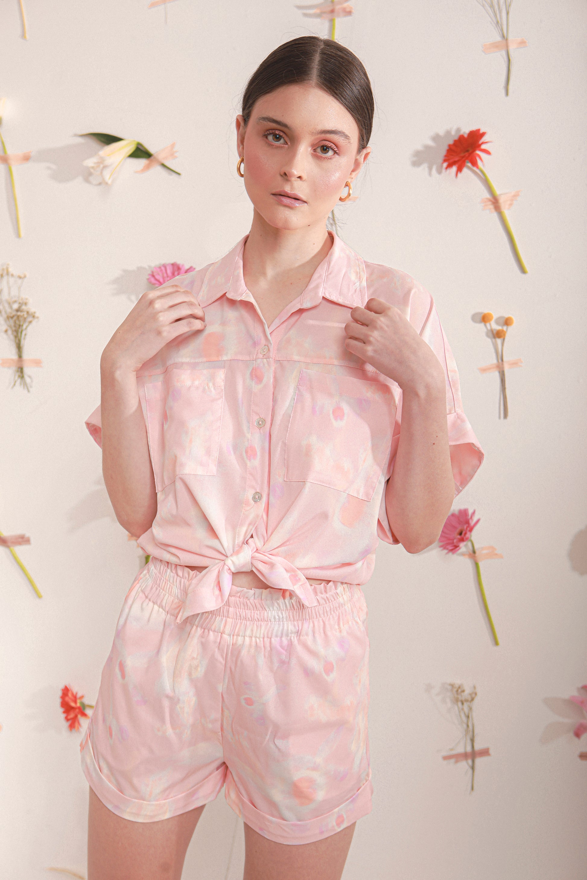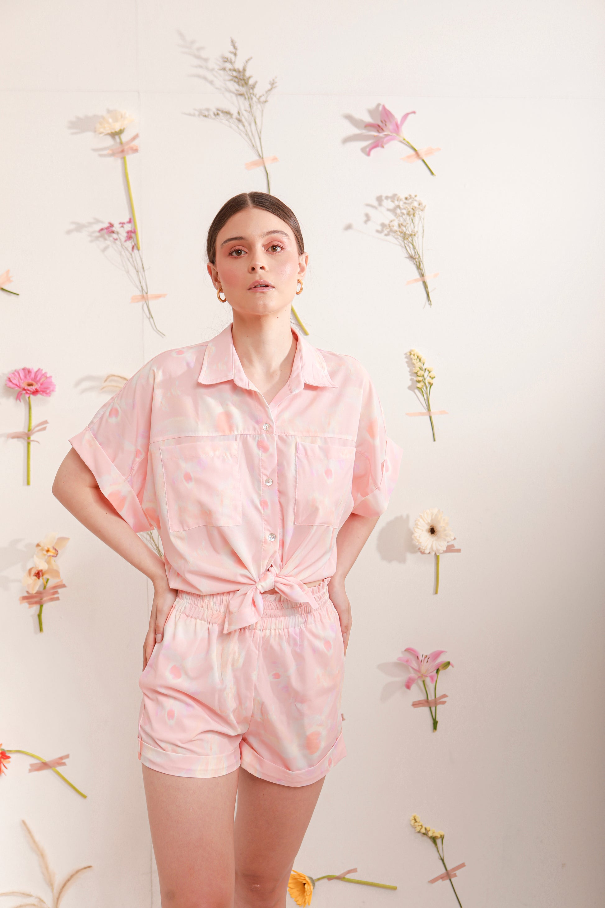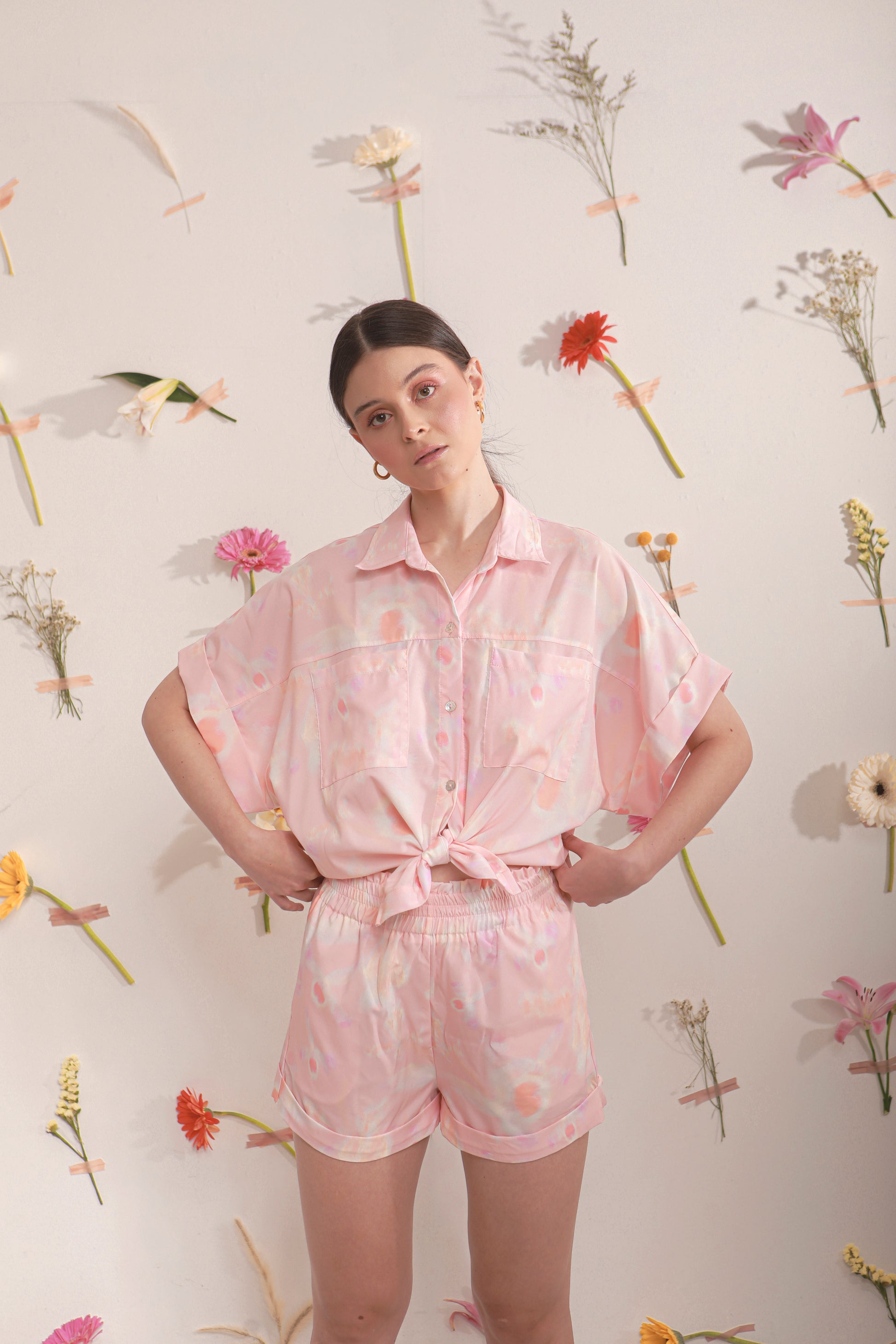 Two-piece set featuring a short-sleeve oversized shirt with a classic collar and front button closure, designed to be tied at the waist. The shorts feature an elastic waistband for added comfort. Made from XXXX, it provides freshness and lightness. Model is wearing size S.