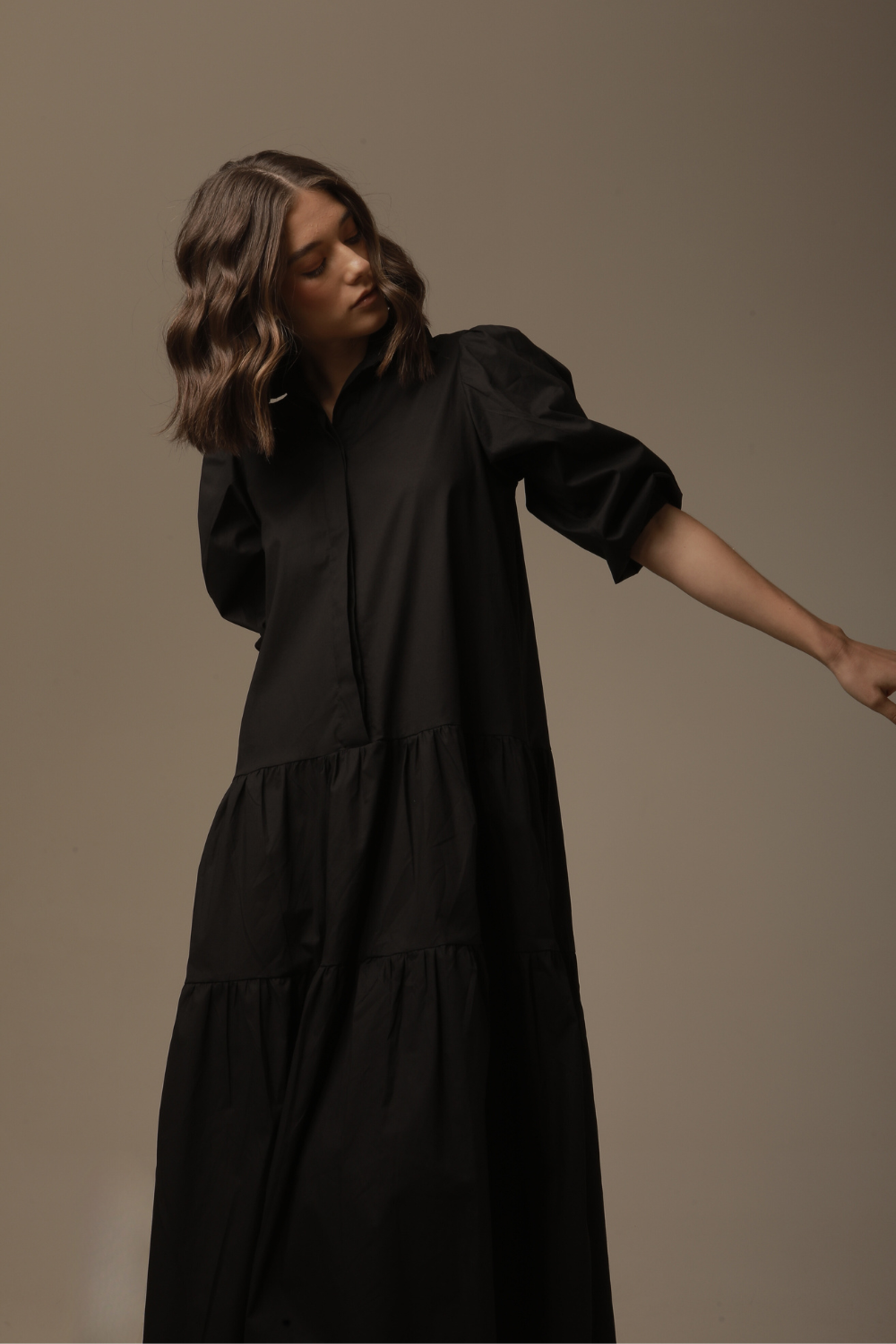 Long shirt-style dress with puff sleeves and concealed front buttons with ruffles. Made from poplin cotton, it offers light structure, freshness, and comfort. Model is wearing size S.