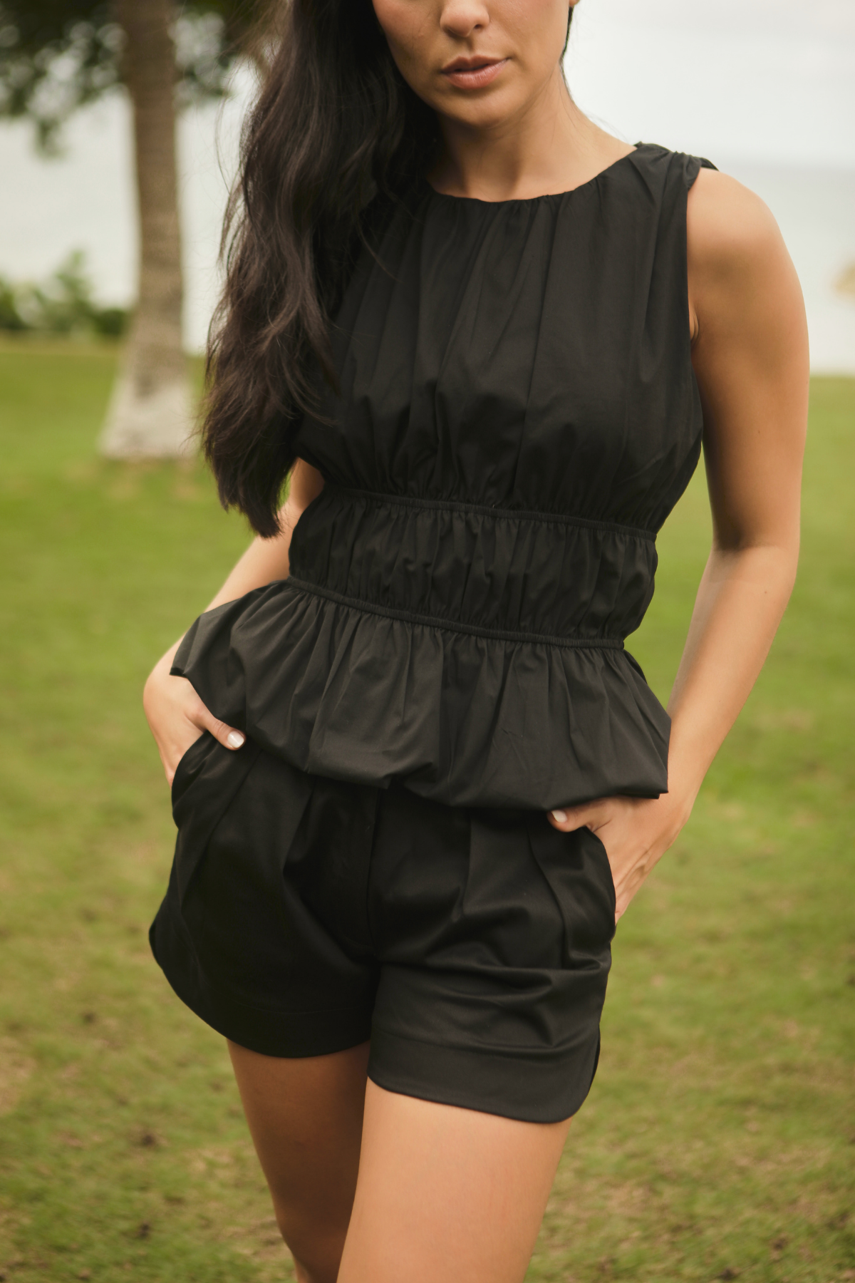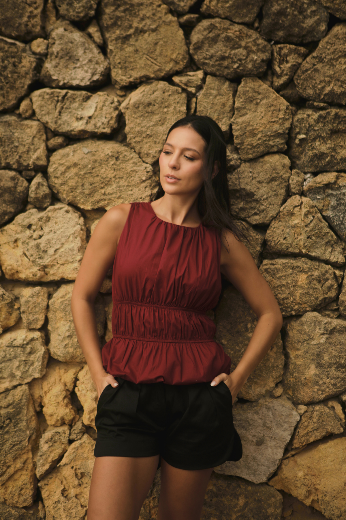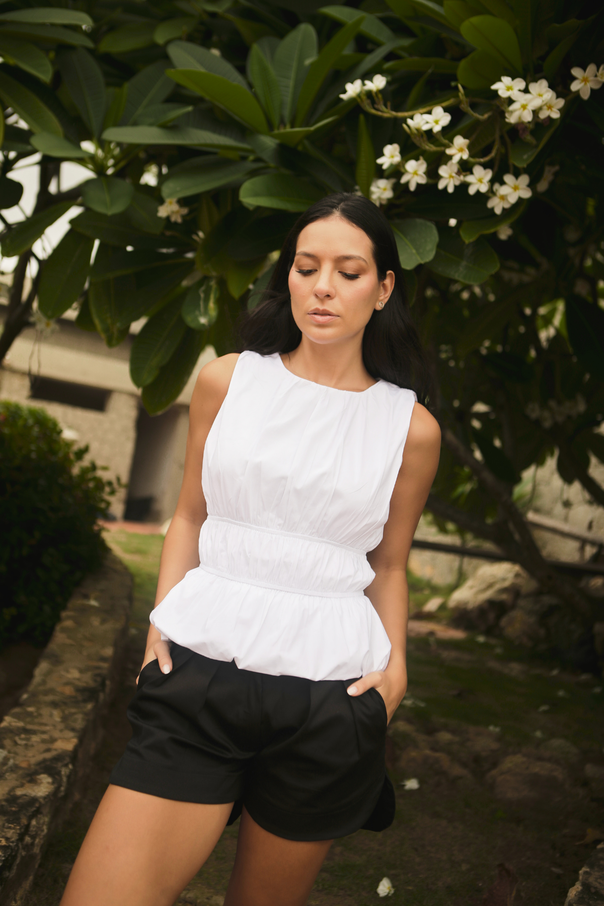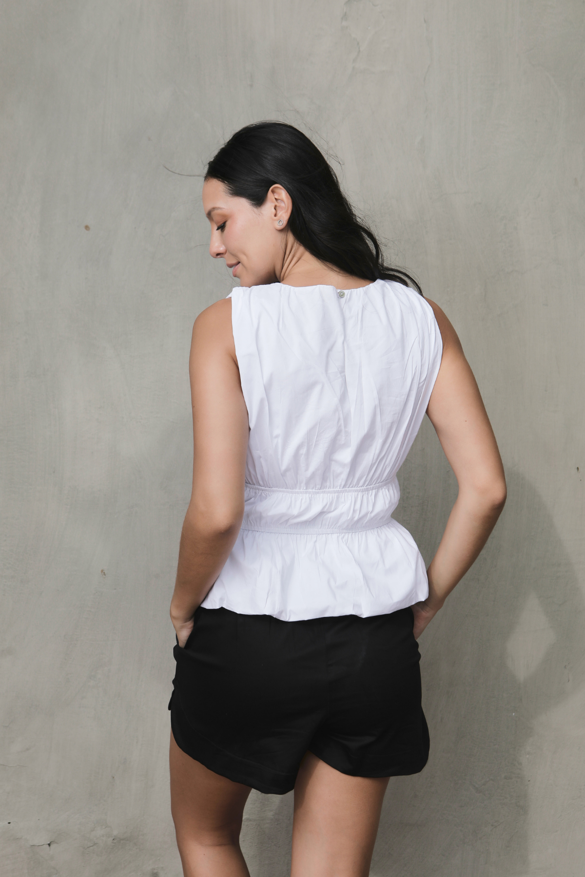 Top with subtle gathers on the front and back that add delicate volume and texture. Crafted in cotton poplin, it is fitted at the waist and finished with an elegant peplum cut that enhances the silhouette in a feminine, sophisticated way. A light and versatile piece ideal for polished looks with a contemporary feel. The model is wearing size S and is 1.74 m tall.