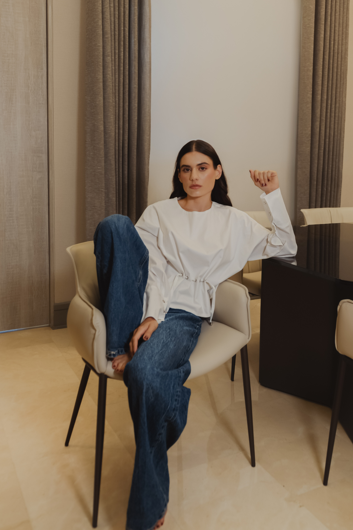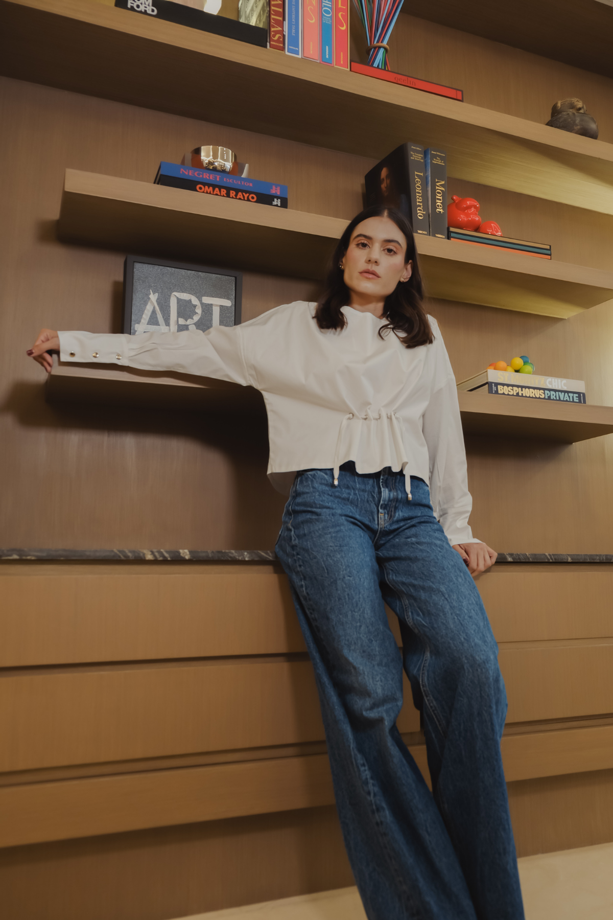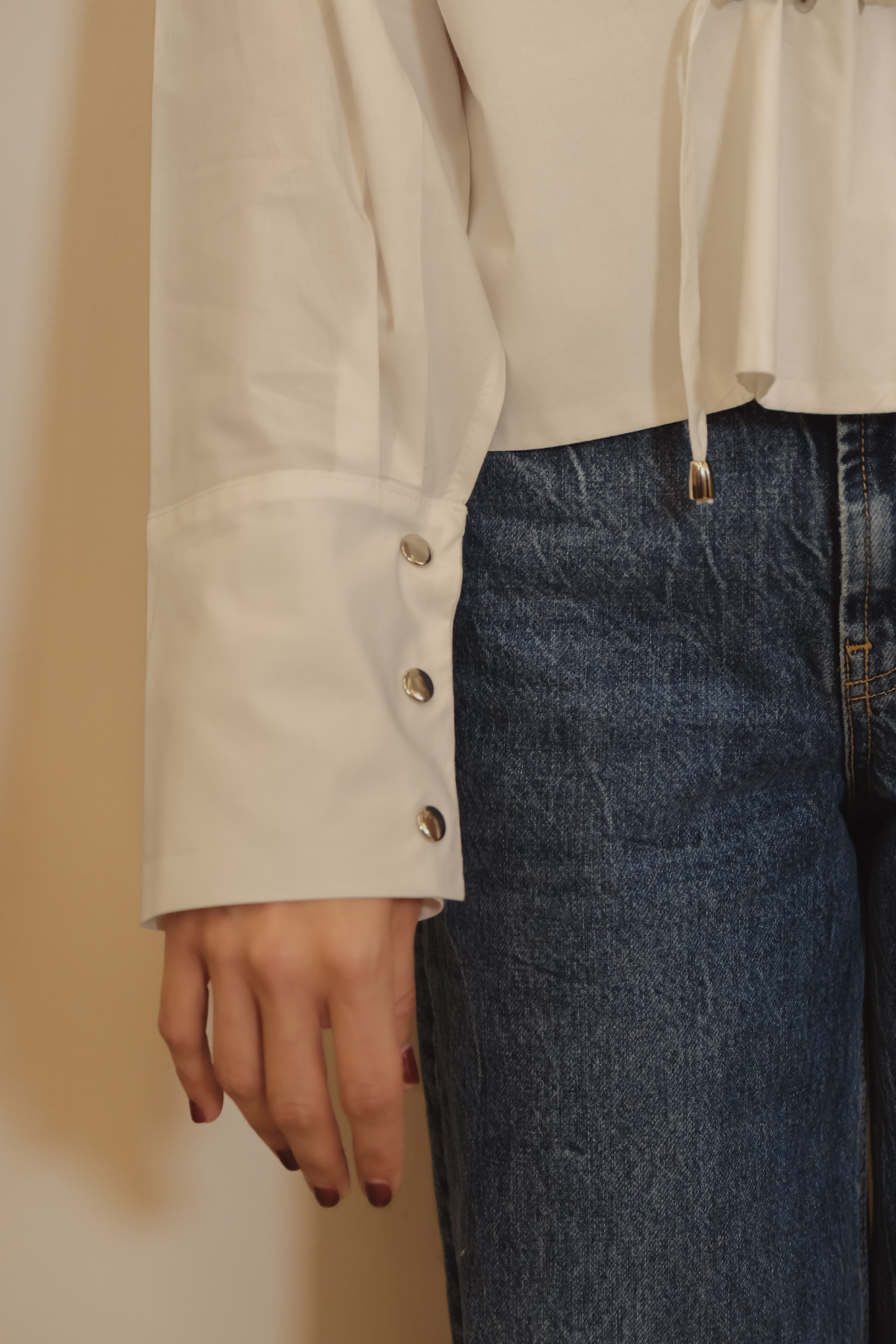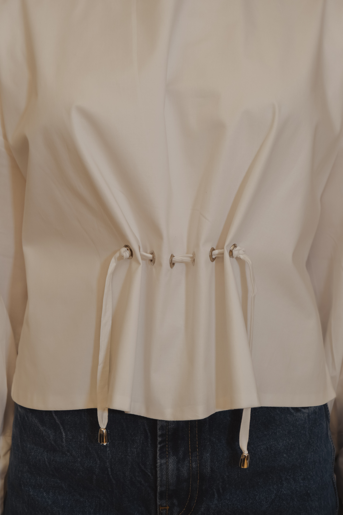 Blouse with a minimalist design and adjustable grosgrain ribbons at the waist for side ties. Features a round neckline and long sleeves. Made from poplin cotton, it’s ideal for a casual or elegant look. Model wears size S.